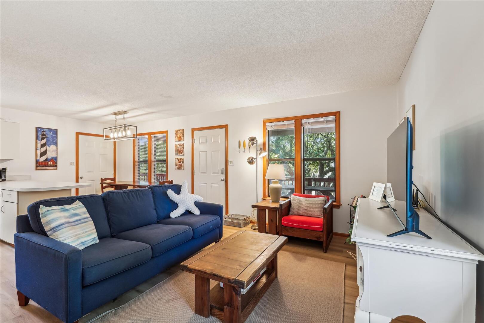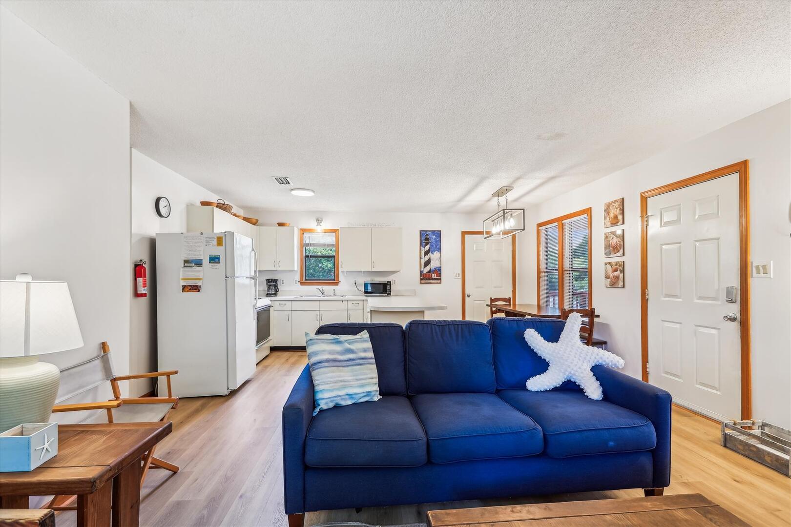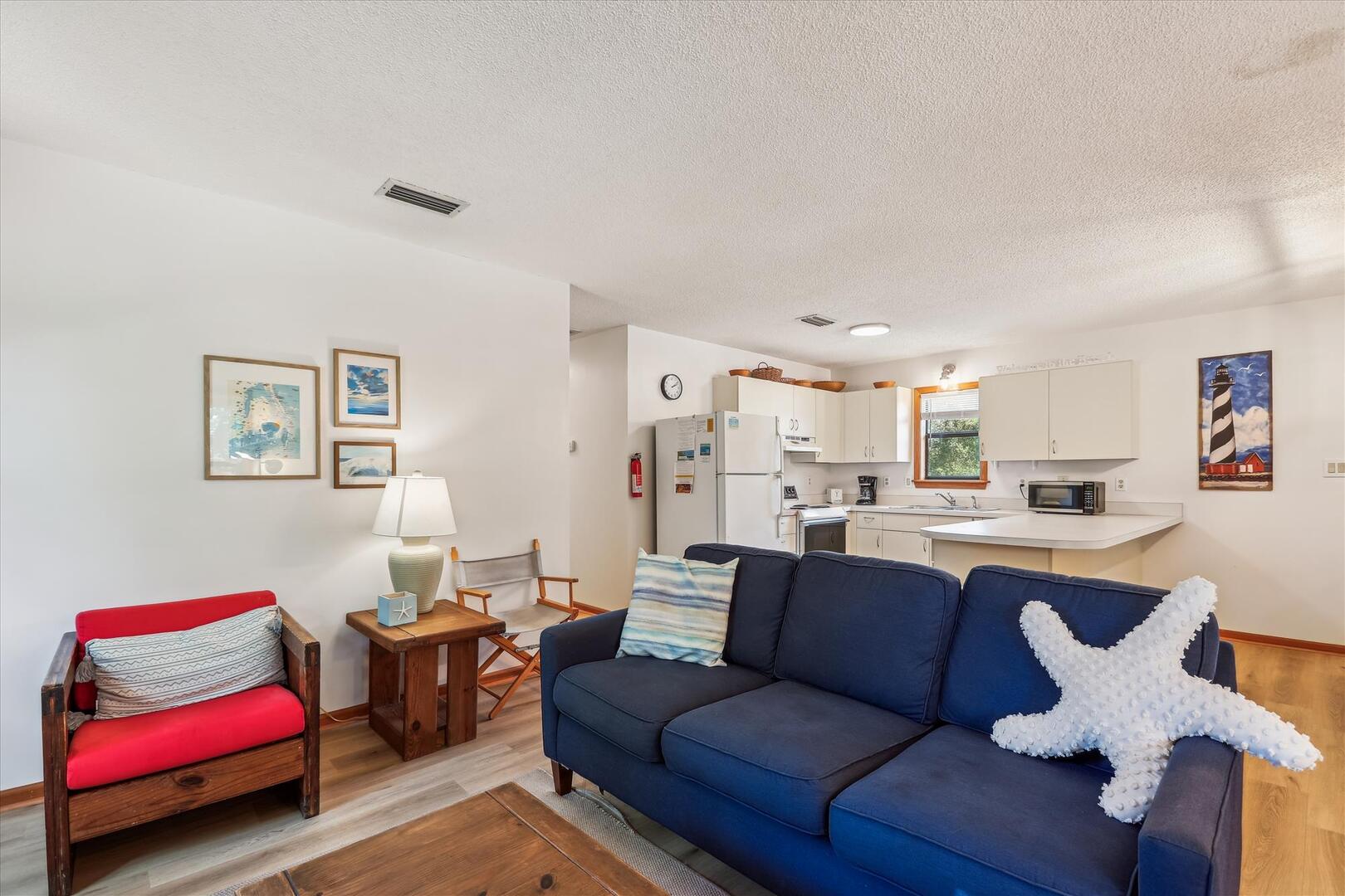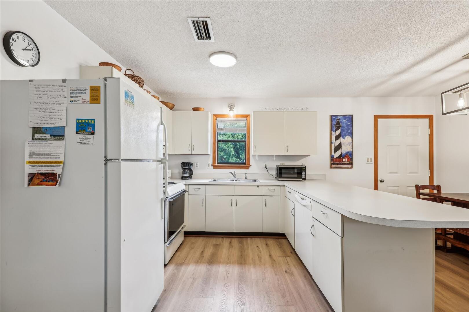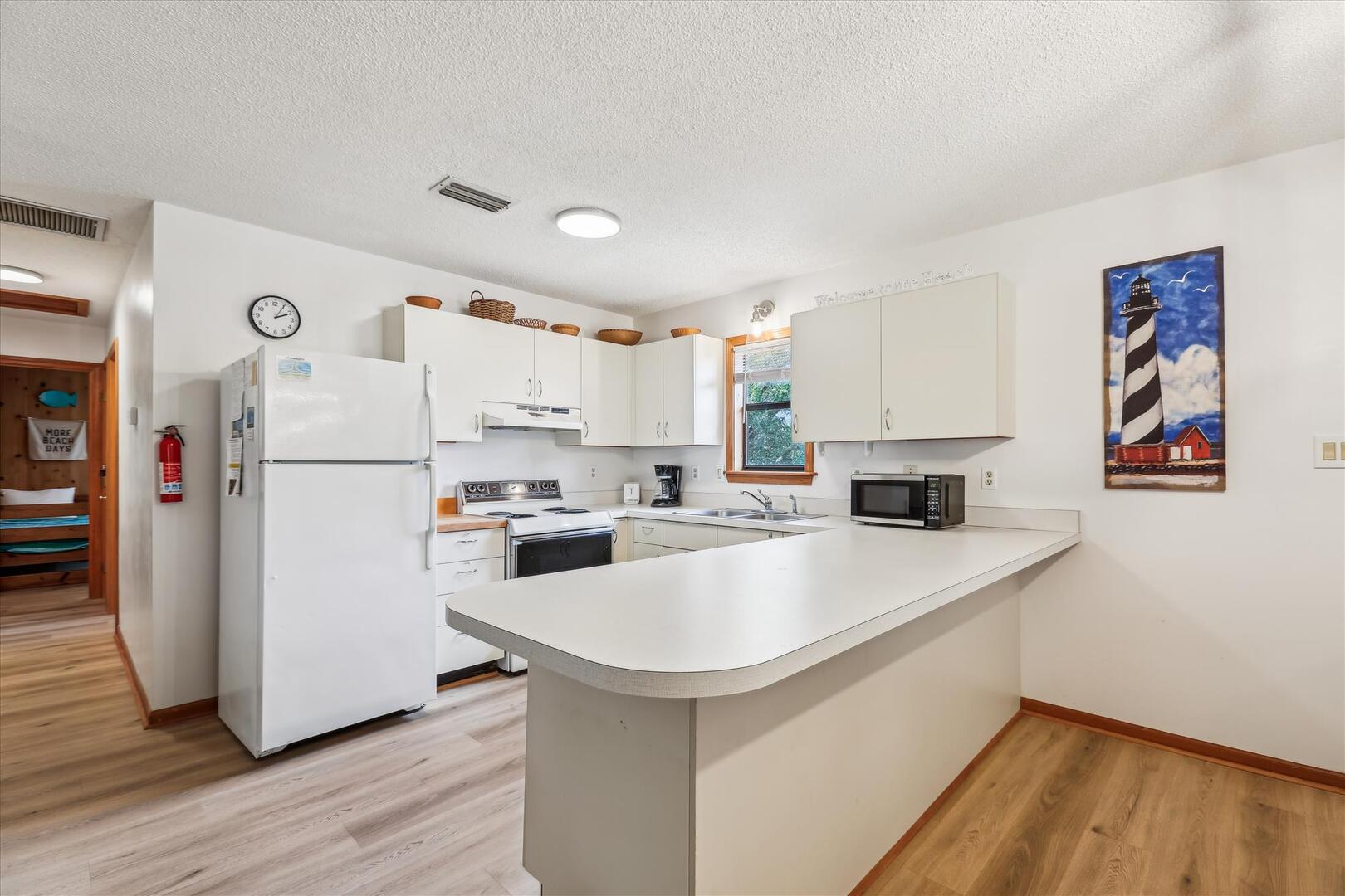 Discover "Bienvenue," your dream vacation getaway that feels like a fresh breath of elegance. Dive into 2024 with brand-new enhancements: sleek flooring, modern ceiling fans and freshly painted walls that radiate calmness. Settle into the family-style living room adorned with charming maritime touches or gather around the rustic dining table. With every detail thoughtfully updated, from the cozy bedspreads to the stylish lighting, "Bienvenue" offers an unparalleled experience of relaxation. Nestled in a quiet, family-friendly neighborhood perfect for bike rides, Bay Drive and Kitty Hawk Bay are a short stroll away. Dine al fresco on the front deck under the live oak tree. The ground floor features covered parking, laundry room and enclosed private shower for rinsing off after a day at the beach! Great location close to Kitty Hawk beach access, Wright Brothers Memorial and Hayman Blvd playground, coffee shops, galleries, restaurants, thrift stores, the new Target and much more. Your ideal getaway awaits.