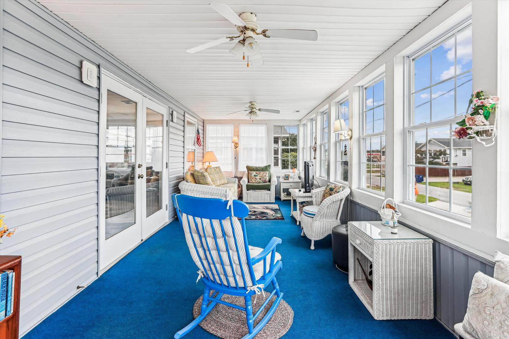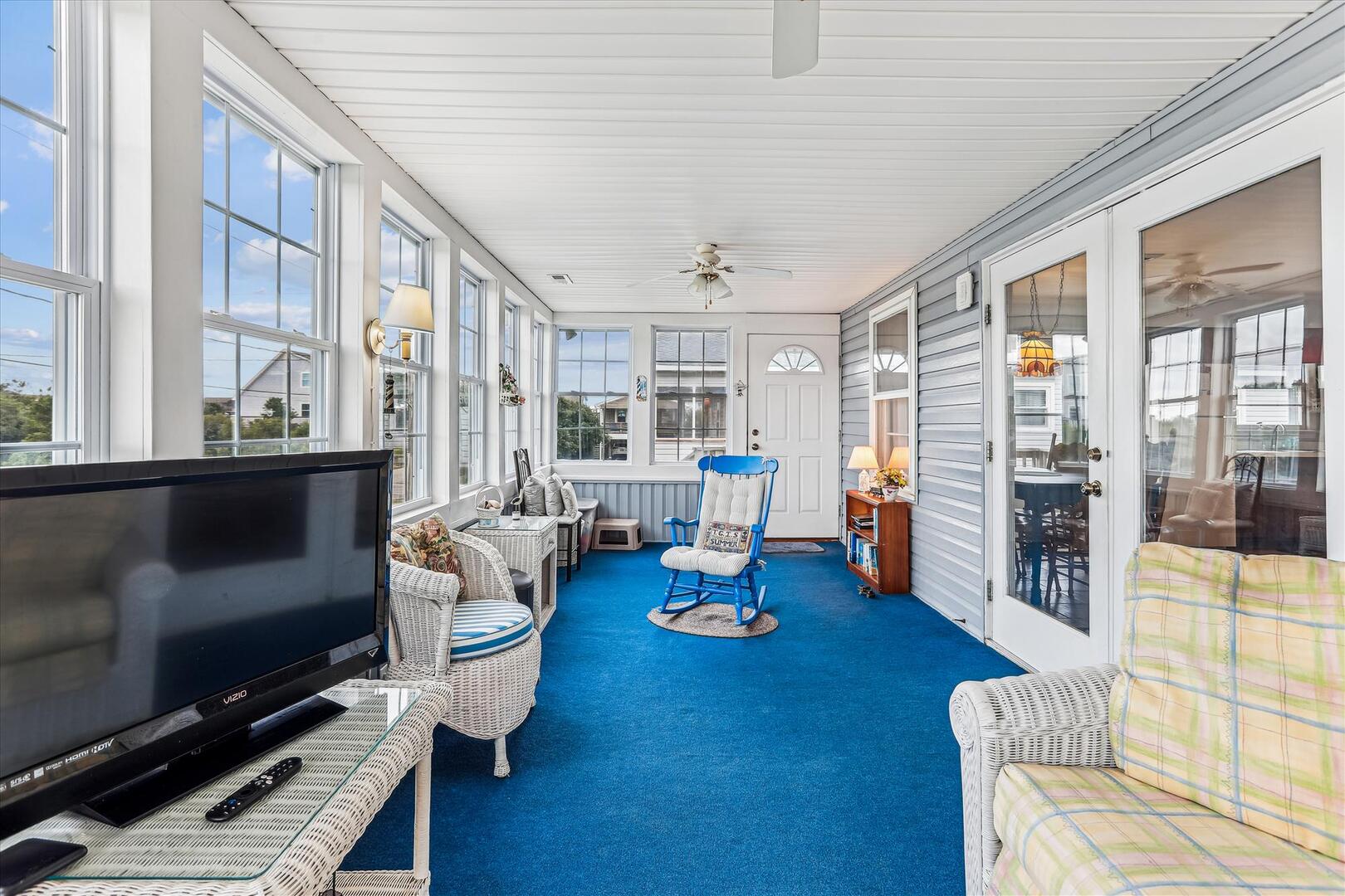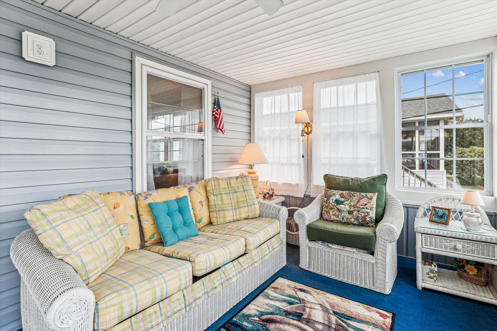 Draped in natural light from surrounding windows, this space is perfect for morning coffees or tranquil afternoons. The wicker furnishings, complemented by plush cushions and a serene coastal rug, set the stage for moments of pure relaxation in the Sunroom. Let the gentle ambiance whisk you away to a peaceful retreat by the sea.