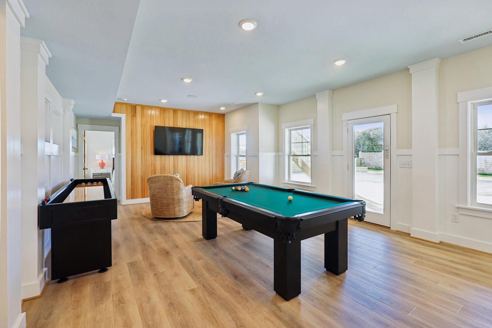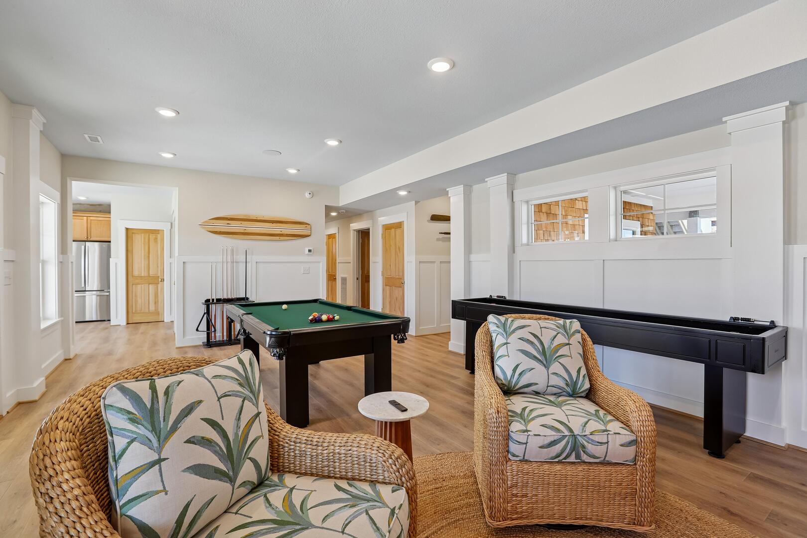Ground Floor: 1 King Bedroom with Private Bathroom, Laundry Room, Powder Room, Game Room, Theater Room, Kitchenette with Ice Maker, Kegerator