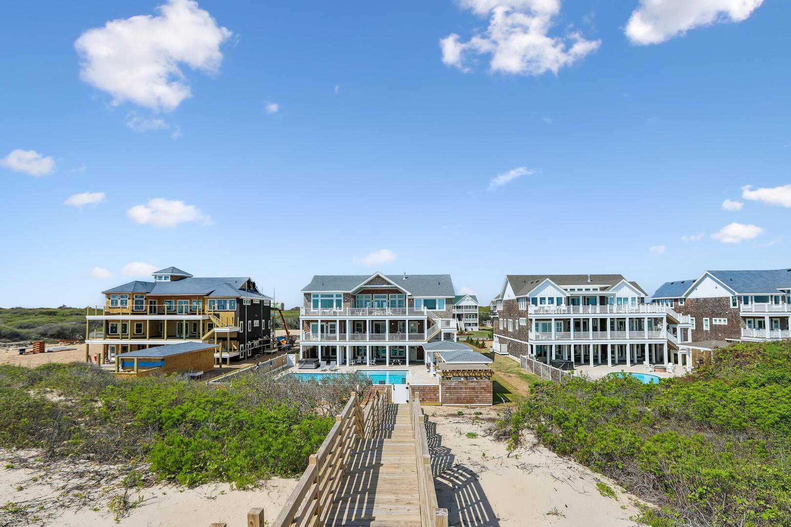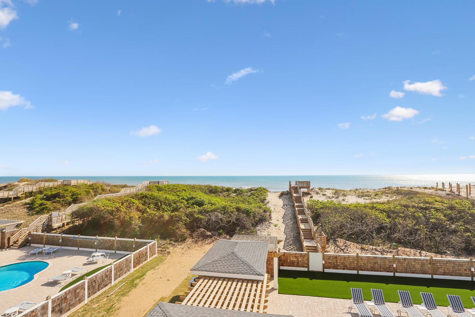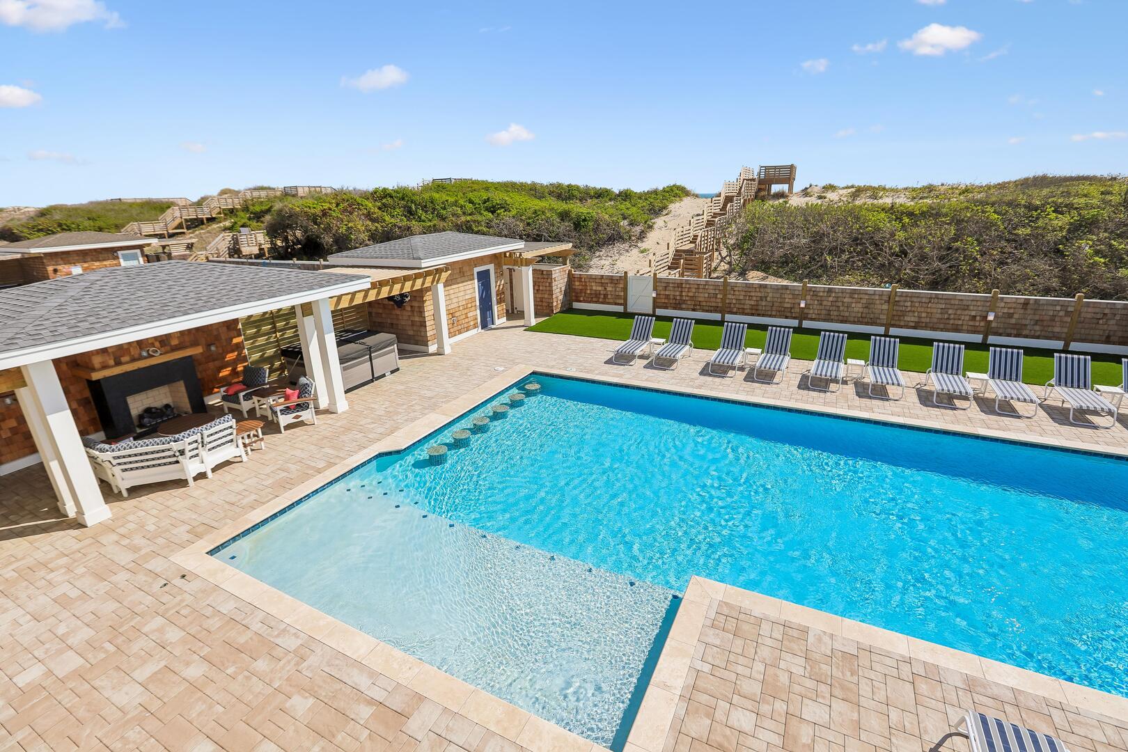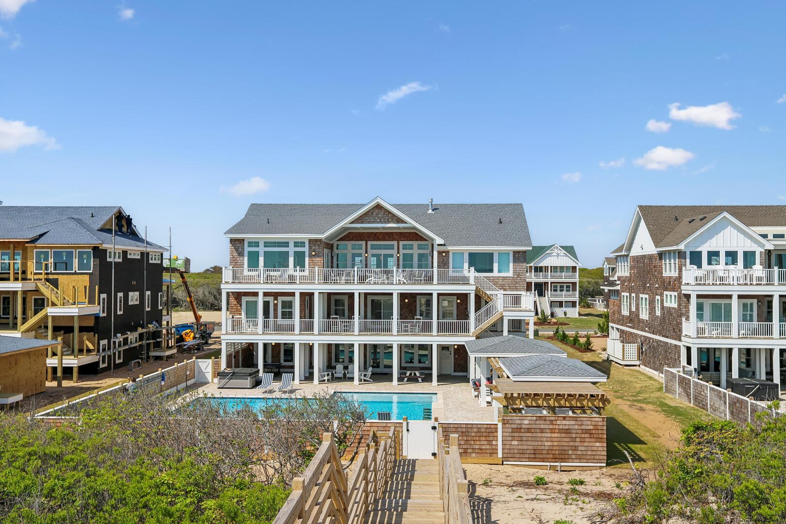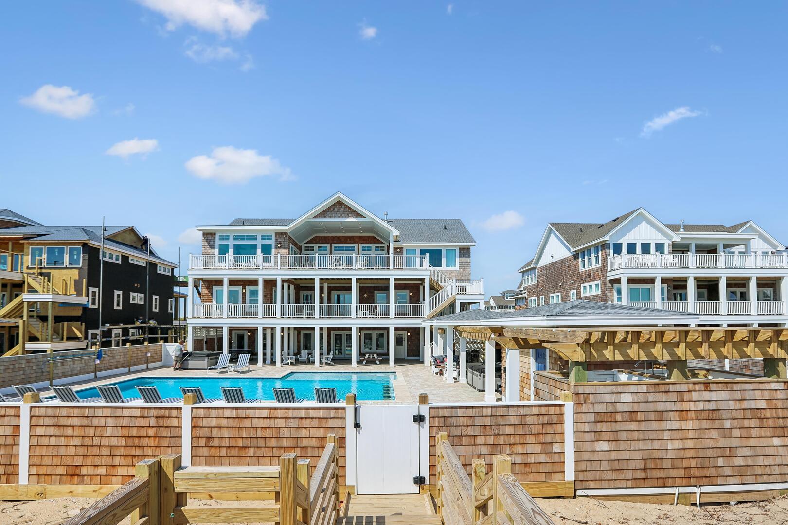 Enjoy a private oceanfront pool, relaxing hot tub, and easy beach access just over the dunes. Inside, an elevator connects all levels for ultimate convenience, while a state-of-the-art theater room, game room, and fitness room provide entertainment and activity options for every age.