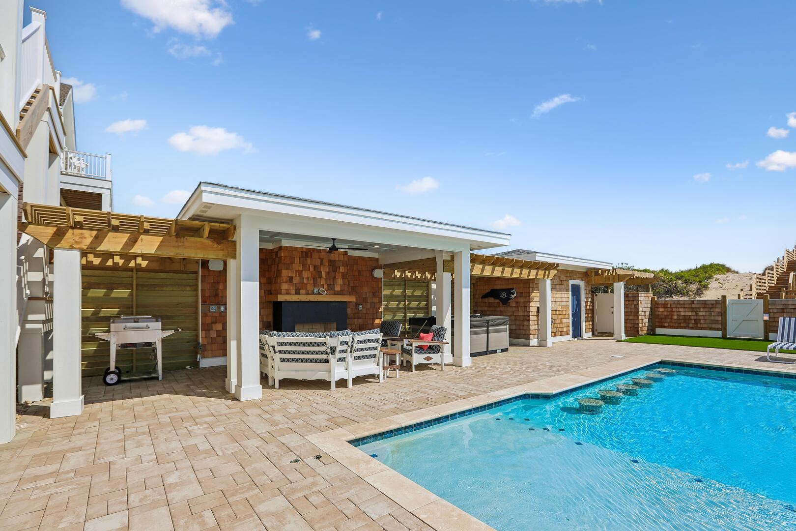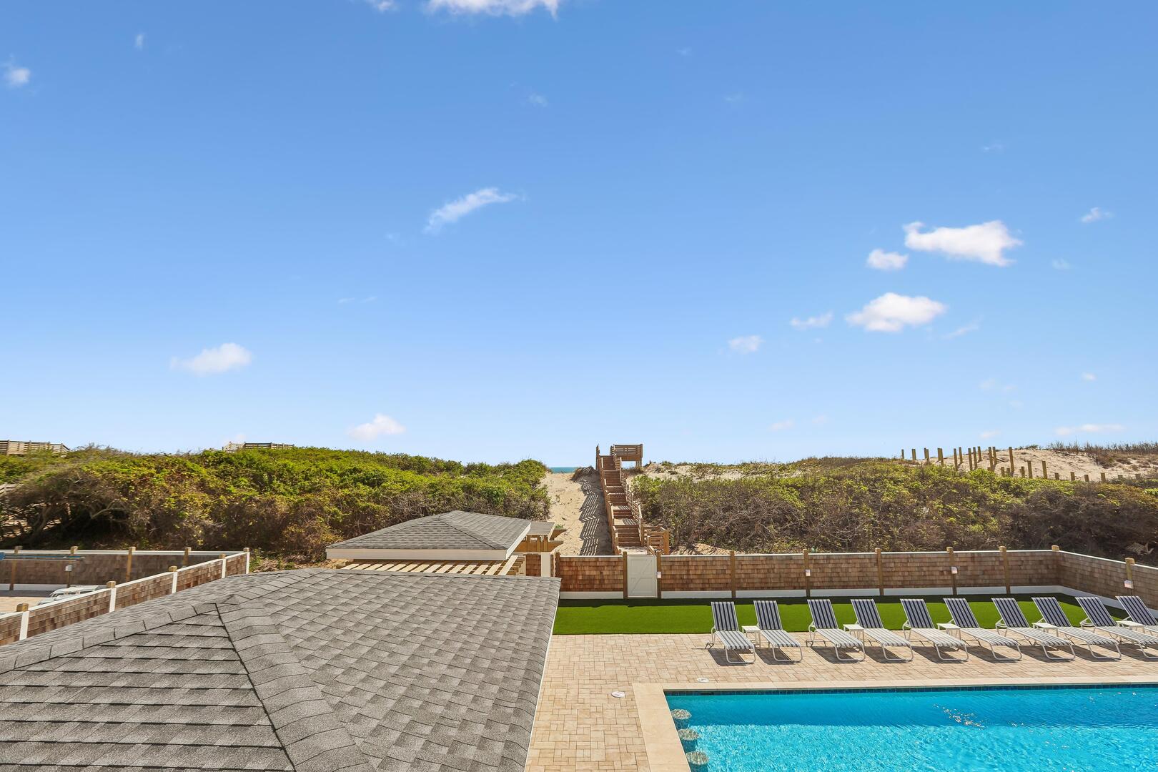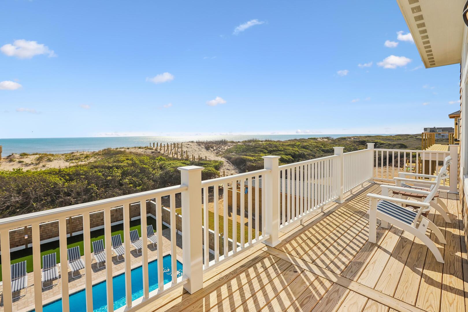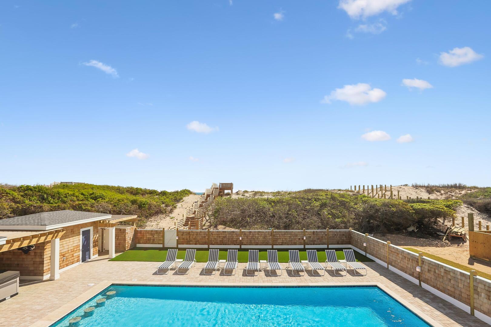 Enjoy a private oceanfront pool, relaxing hot tub, and easy beach access just over the dunes. Inside, an elevator connects all levels for ultimate convenience, while a state-of-the-art theater room, game room, and fitness room provide entertainment and activity options for every age.