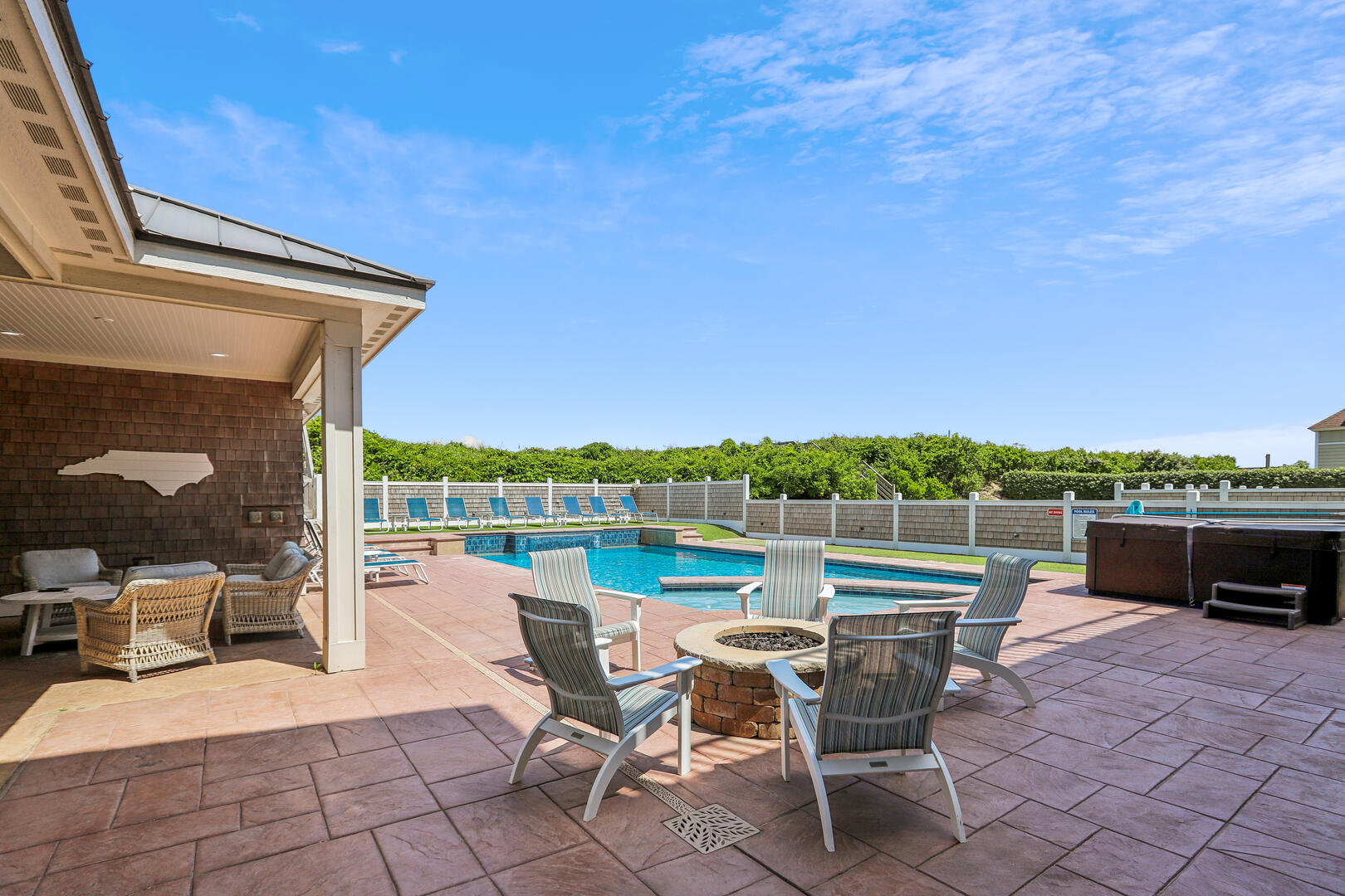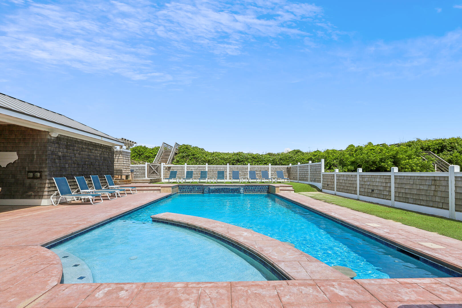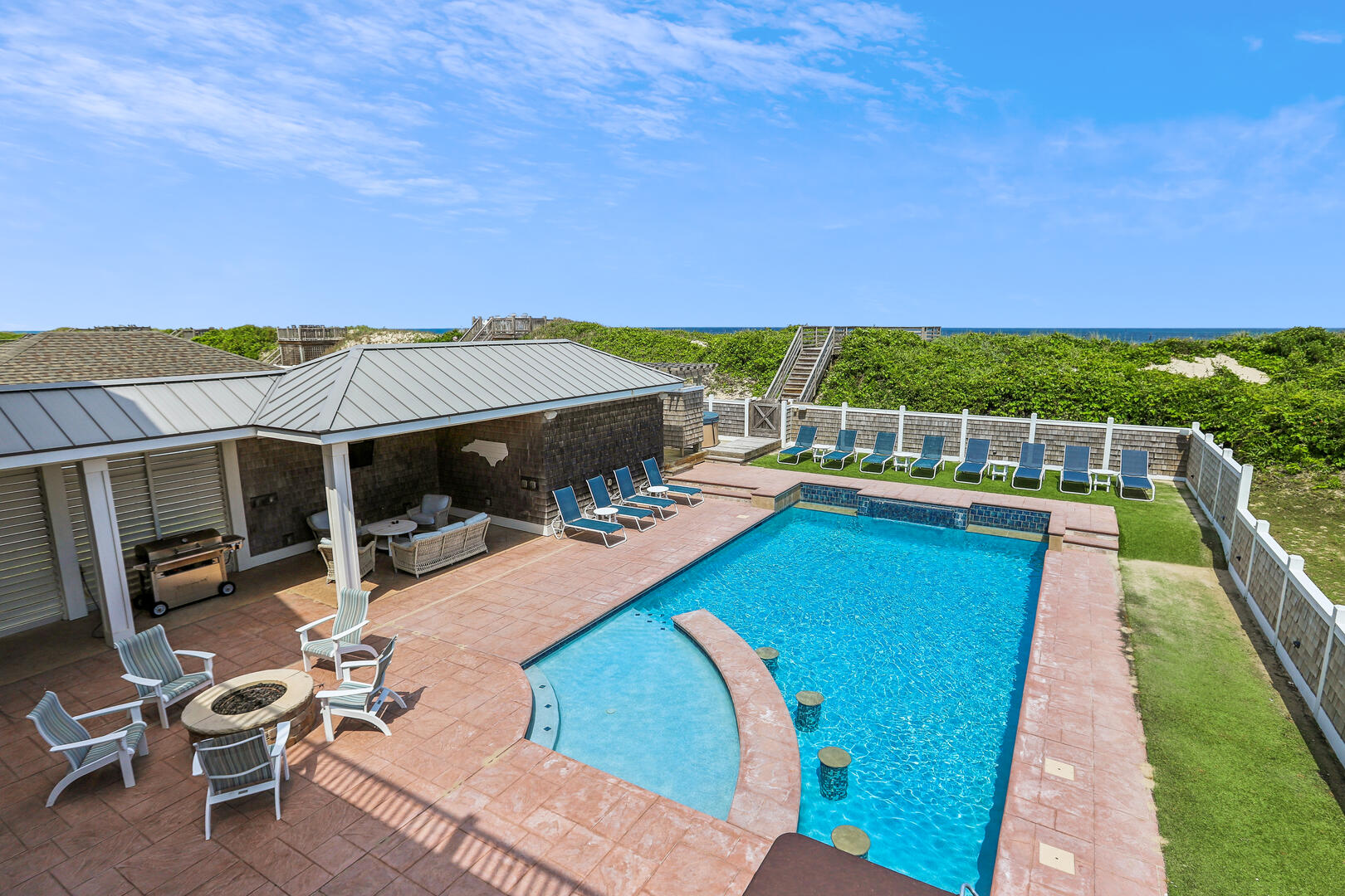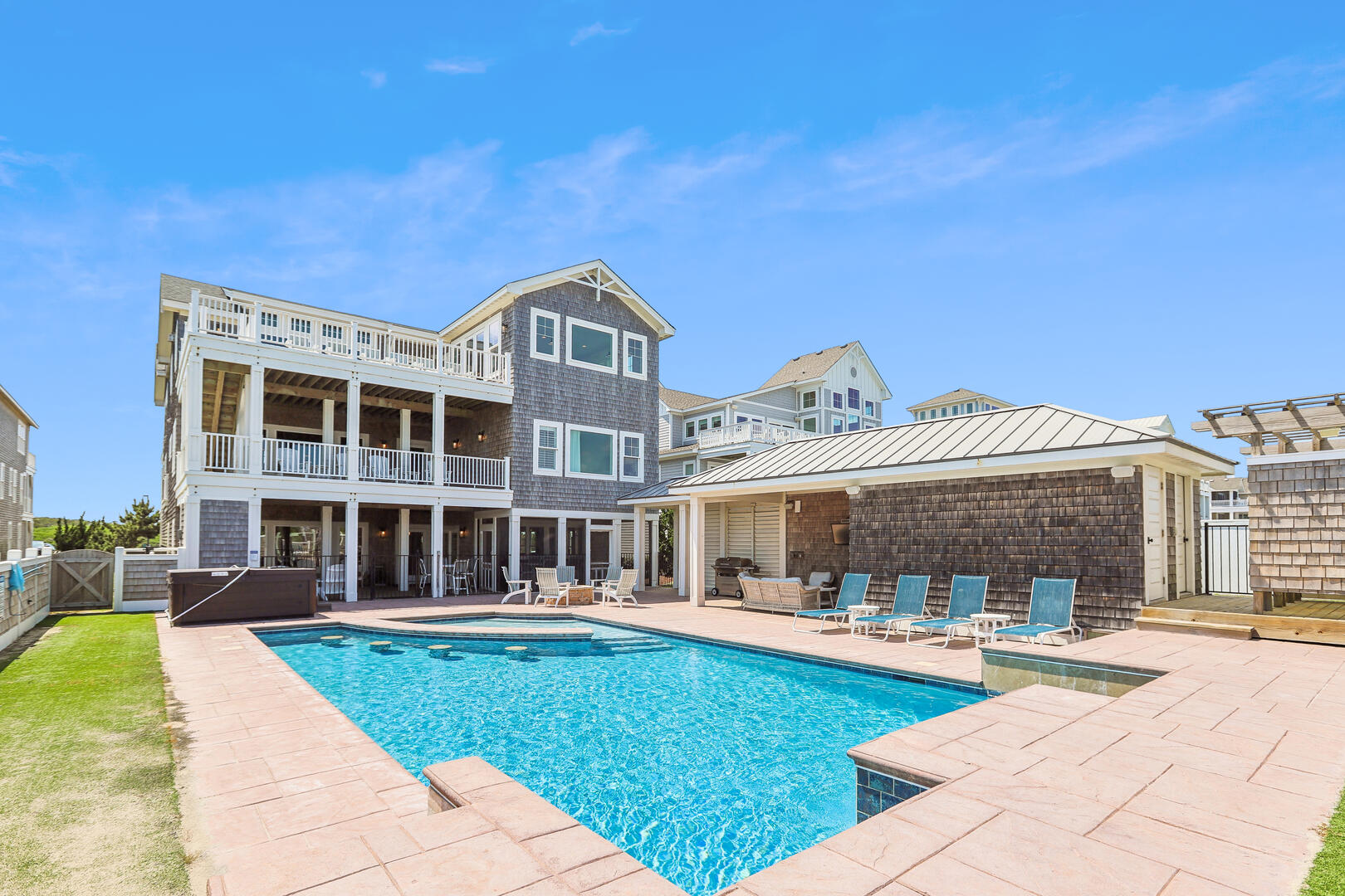 Knot Home is a premier 16-bedroom oceanfront estate designed for large gatherings, located in the exclusive Pine Island Club Community of Corolla. The property hosts an extensive resort-style outdoor area, including a large private pool with a bar and poolside cabana, a hot tub, and a fire pit, and it provides a private walkway directly to the oceanfront beach. Guests can enjoy breathtaking panoramic ocean-to-sound views from numerous comfortable outdoor living spaces, including open decks and covered porches. With an elevator providing easy access to all 16 private bathroom suites, this property is perfect for your wedding, family reunion or even a company retreat! Premium linens and bed-making services are included for every stay.