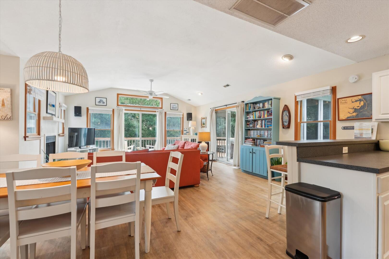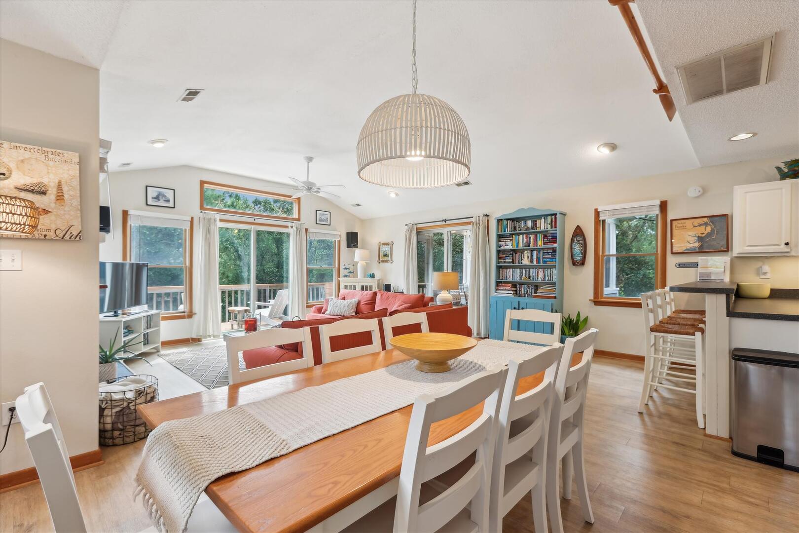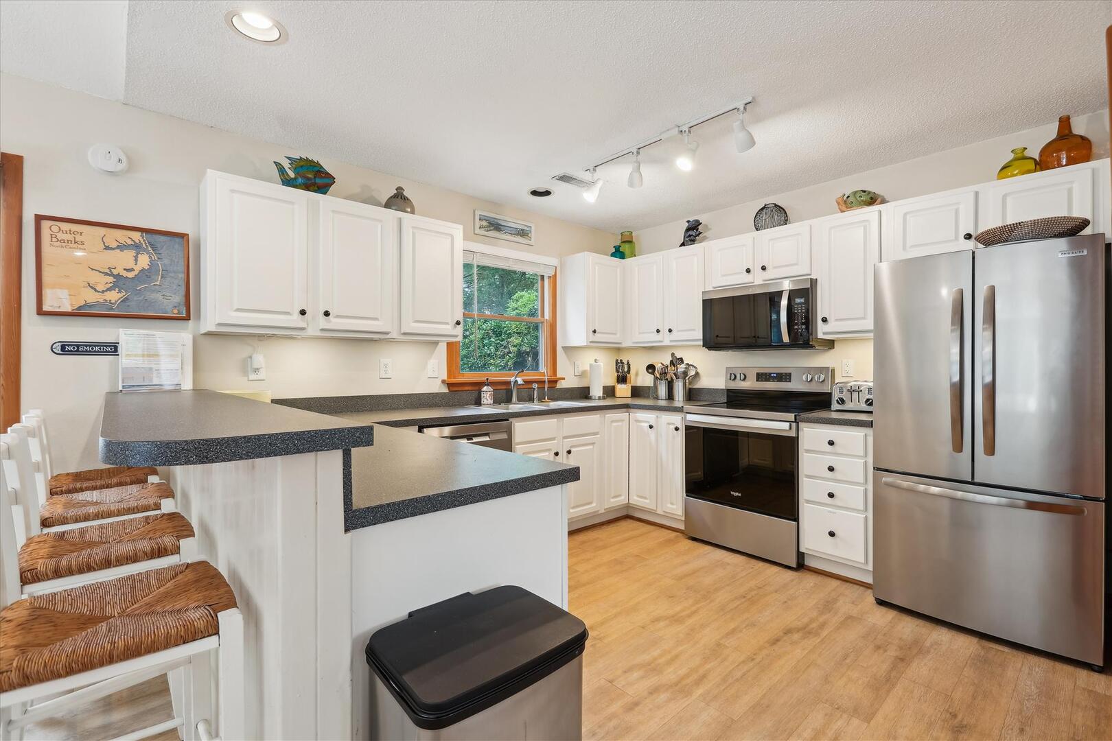 Located in the quiet residential neighborhood of Chicahauk in Southern Shores, this vacation home is just a short walk to the beach and offers plenty of opportunities for family activities during your stay, including biking, boating, swimming, surfing, shell seeking, and more! The spacious kitchen, adorned with coastal accents and equipped with every essential, invites you to whip up your favorite meals while reminiscing about the day's adventures. The light streaming through the large windows brightens the space, evoking feelings of warmth and relaxation. Whether you're brewing your morning coffee or preparing a family feast, this home ensures a comfortable and memorable stay, making every moment of your vacation truly special.
