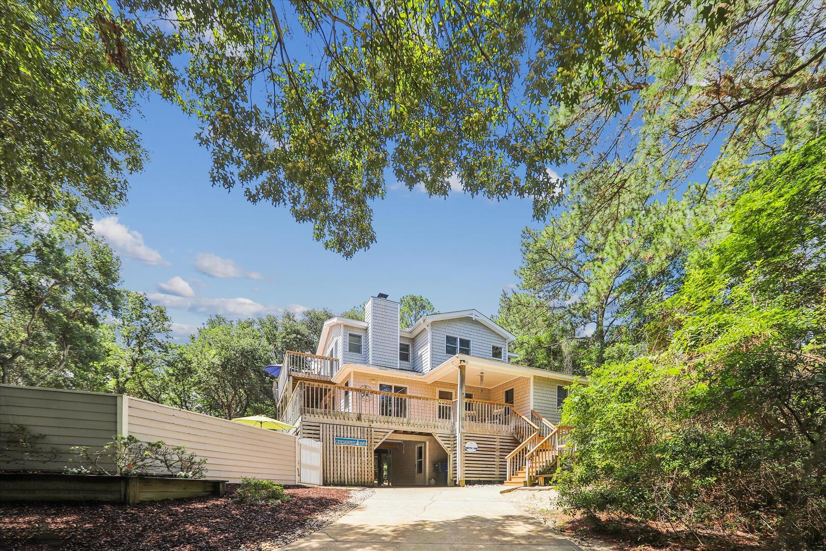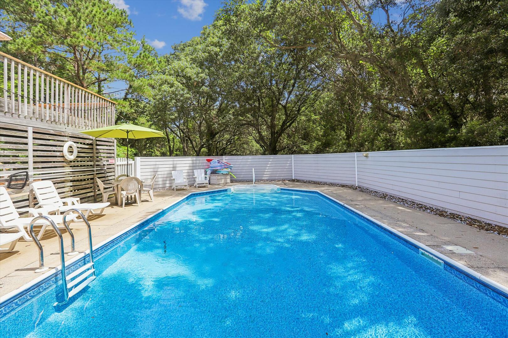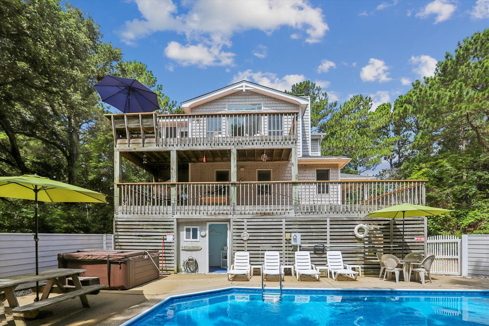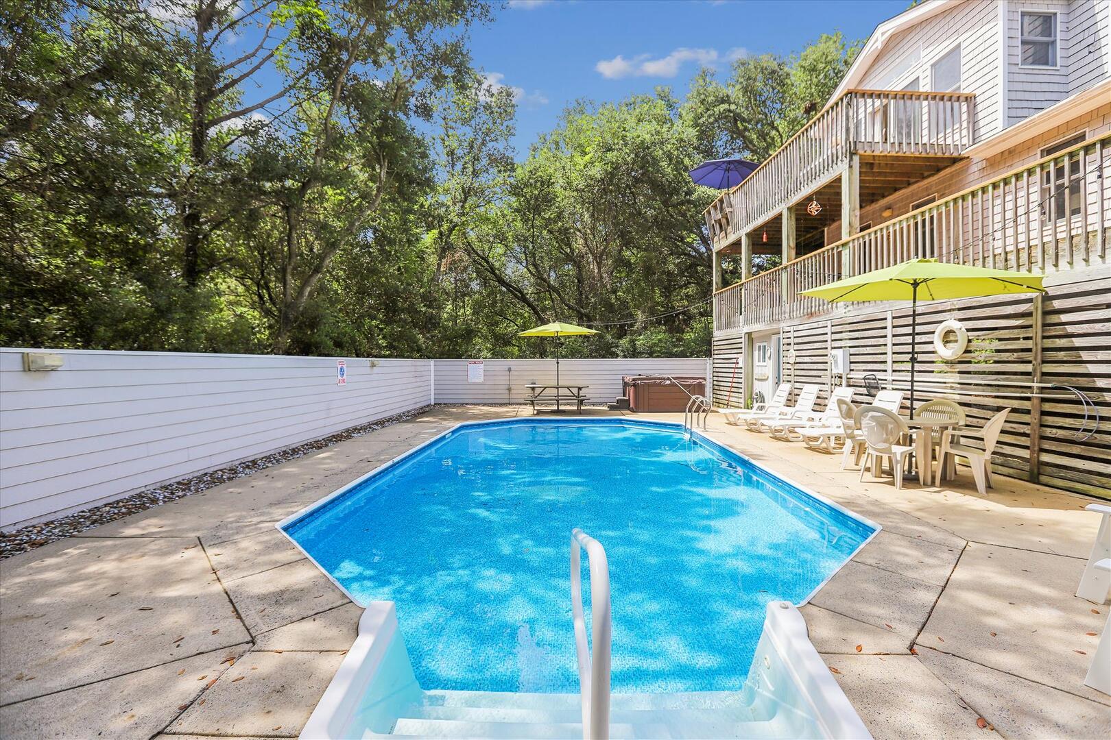 But, you may never want to leave Leeward Inn with all the amenities it has to offer! A Private Pool in the backyard with Hot Tub, lounge chairs, and even a convenient bathroom beside the pool area make it a great spot for families to spend the day. Pool available 5/6-10/7. There is even a swing and sandbox under the house where the kids can play in the shade. Double wraparound decks offer both sun and shade with built-in benches, deck chairs, and even a hammock to relax in! A screened porch with a picnic table is on the top level and is a perfect spot for a quick outdoor meal. Cook up that meal on the built-in charcoal grill and you'll have hamburgers and hot dogs for a crowd in no time! Inside, the comfortable furnishings will make your family feel at home. The full kitchen with a dishwasher and microwave make it easy to prepare a quick breakfast or a big family dinner, and the washer and dryer provided help to keep bathing suits and beach towels ready for another day of Fun in the Sun. Central air and heat, as well as ceiling fans, will keep everything cool and comfortable even on the hottest OBX days. Fireplace is decorative only.