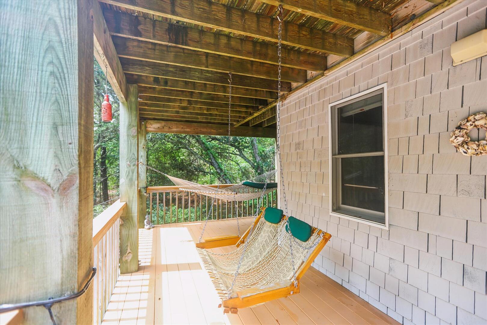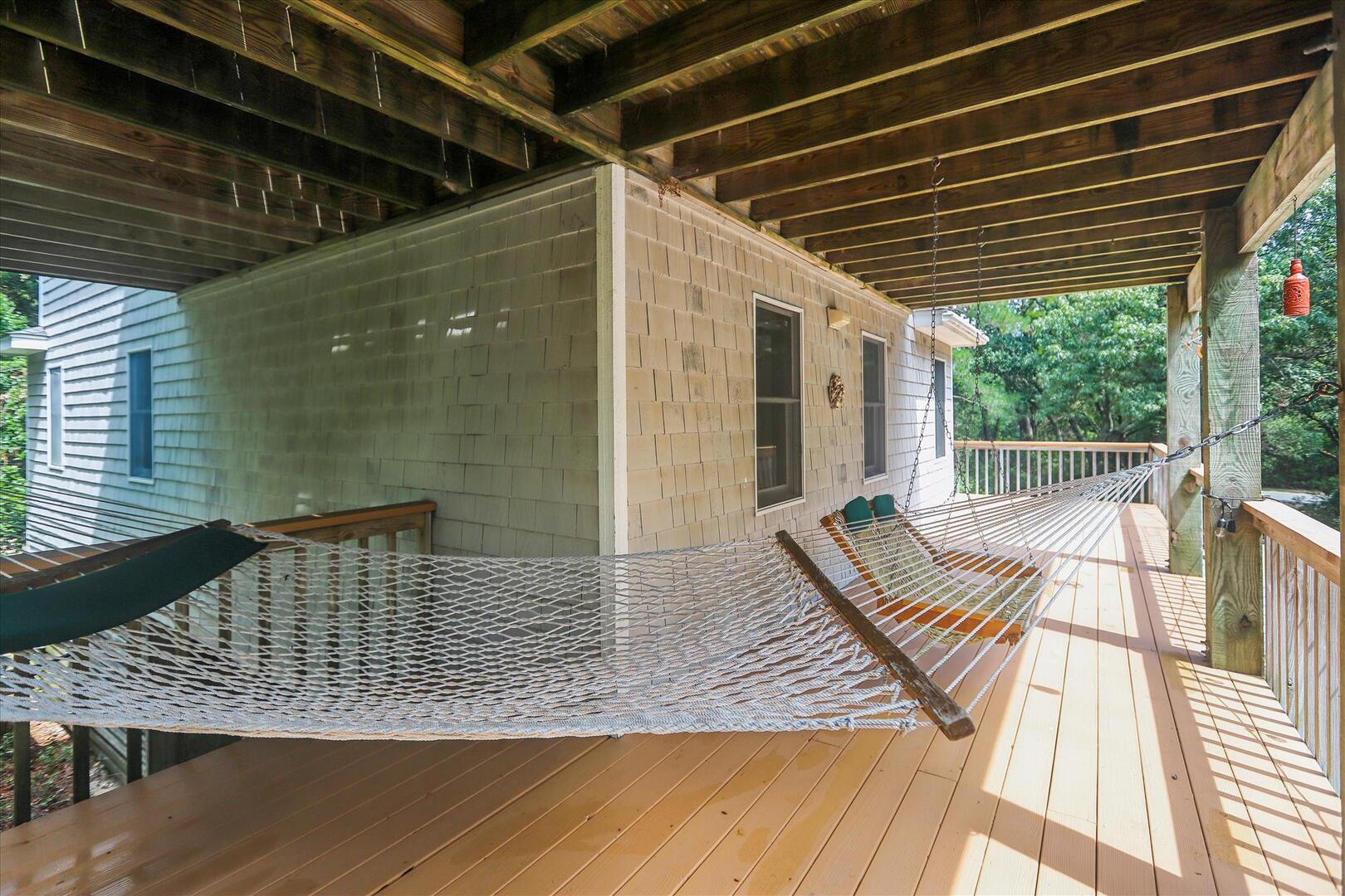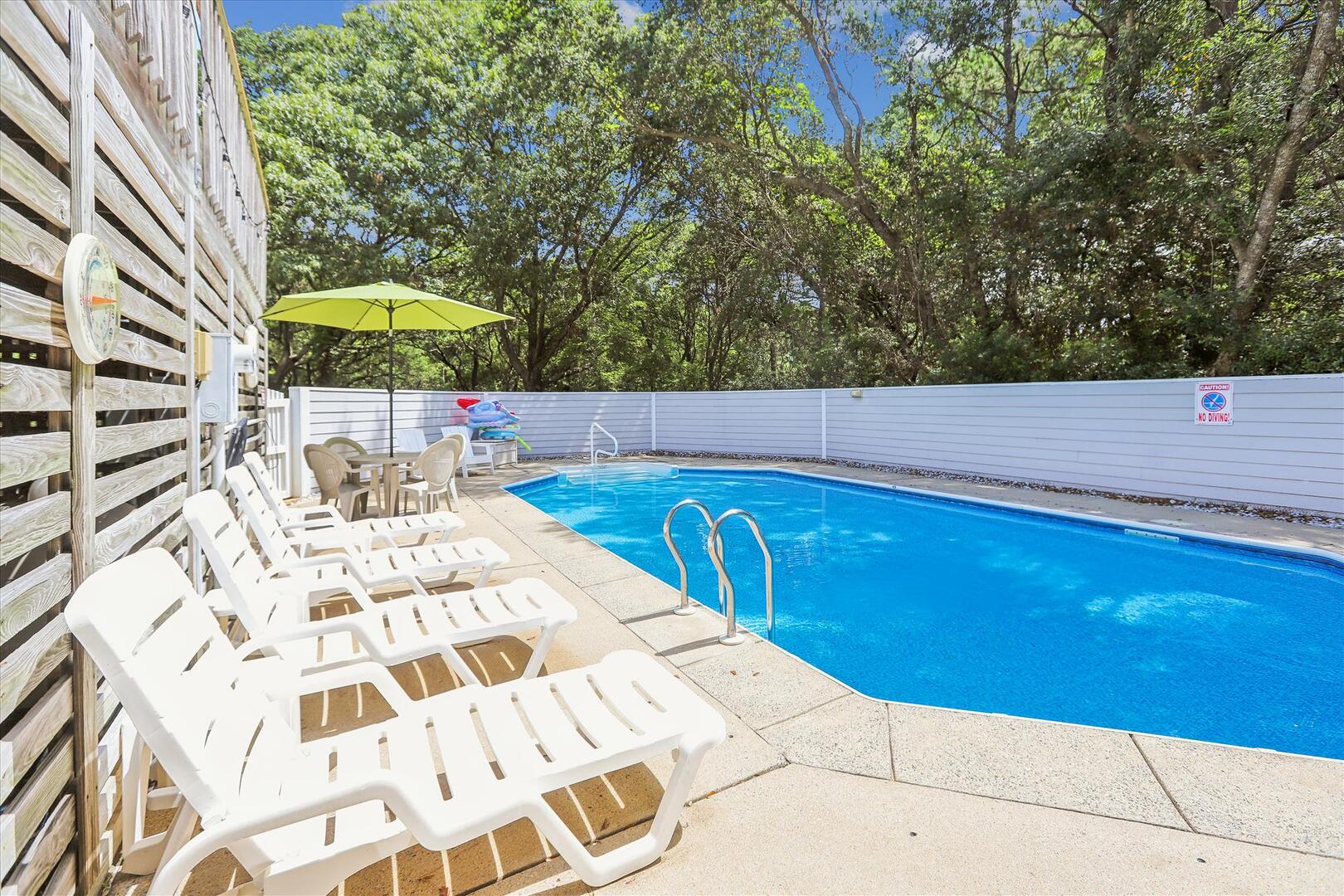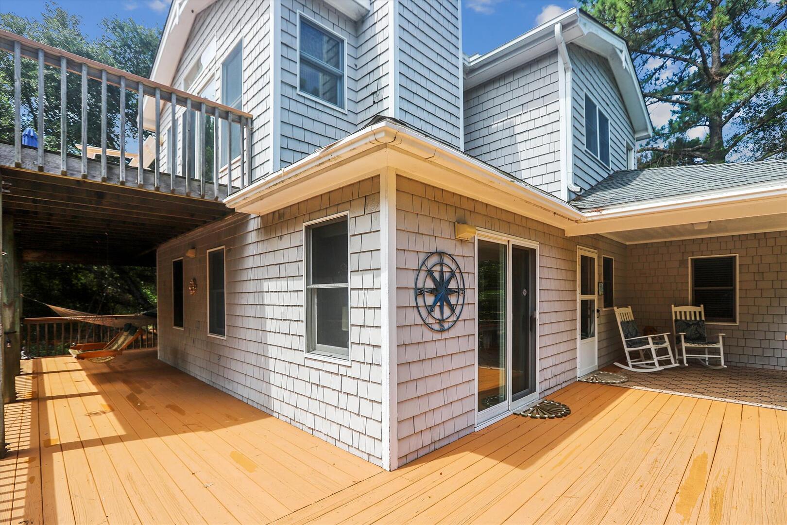 But, you may never want to leave Leeward Inn with all the amenities it has to offer! A Private Pool in the backyard with Hot Tub, lounge chairs, and even a convenient bathroom beside the pool area make it a great spot for families to spend the day. Pool available 5/6-10/7. There is even a swing and sandbox under the house where the kids can play in the shade. Double wraparound decks offer both sun and shade with built-in benches, deck chairs, and even a hammock to relax in! A screened porch with a picnic table is on the top level and is a perfect spot for a quick outdoor meal. Cook up that meal on the built-in charcoal grill and you'll have hamburgers and hot dogs for a crowd in no time! Inside, the comfortable furnishings will make your family feel at home. The full kitchen with a dishwasher and microwave make it easy to prepare a quick breakfast or a big family dinner, and the washer and dryer provided help to keep bathing suits and beach towels ready for another day of Fun in the Sun. Central air and heat, as well as ceiling fans, will keep everything cool and comfortable even on the hottest OBX days. Fireplace is decorative only.
