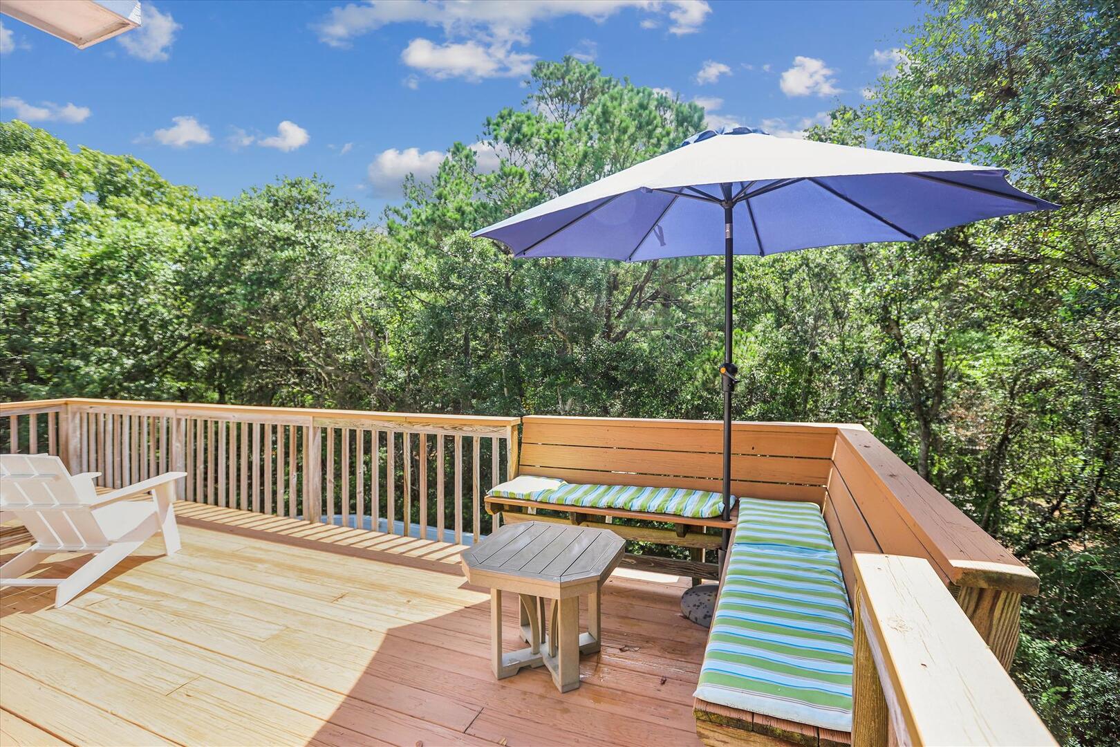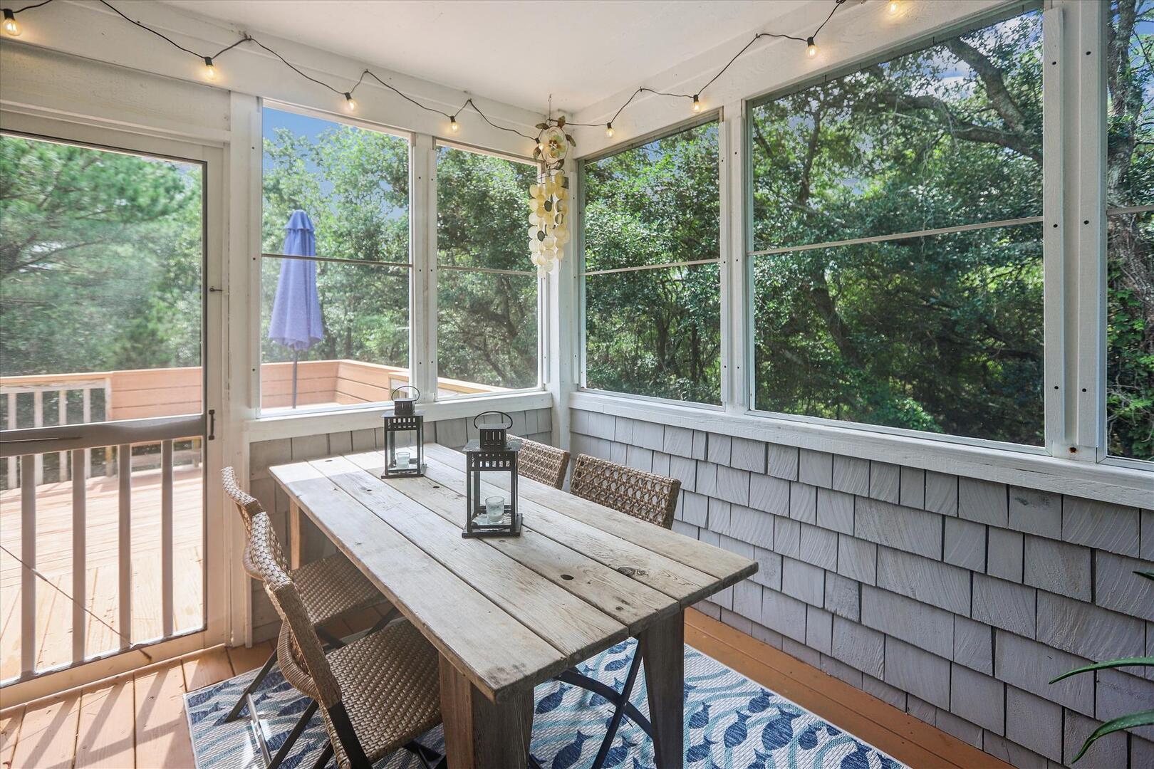 - Top Level: Living Area, Kitchen with breakfast bar, Dining Area, Screened Porch with Picnic Table